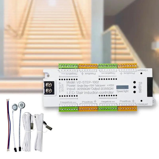 Controler Inteligent pentru Iluminat Scări 220V 12-24V – 32 Trepte cu Senzori de Mișcare și Intensitate Variabilă