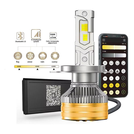 Set 2 Becuri LED Auto Premium cu Aplicatie Smart – Culoare Reglabilă Galben-Alb Rece (3000K-6500K), Putere 210W, 27.000 Lumeni, CANBUS Fără Eroare