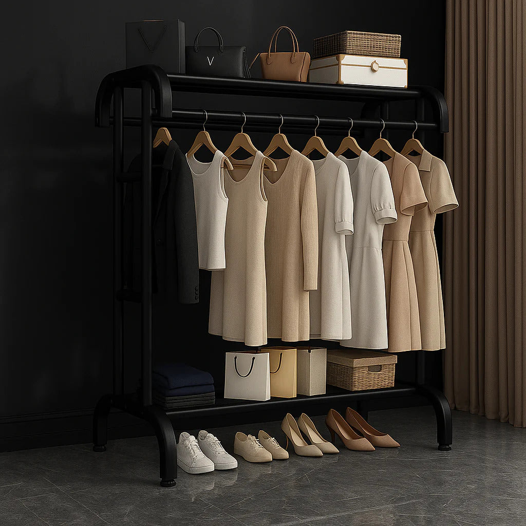 Transformă-ți dressingul sau dormitorul într-un spațiu ordonat și stilat! Acest suport robust din metal oferă două bare pentru umerașe, raft superior pentru depozitare și un compartiment practic pentru încălțăminte — tot ce ai nevoie pentru hainele tale. 👗👠